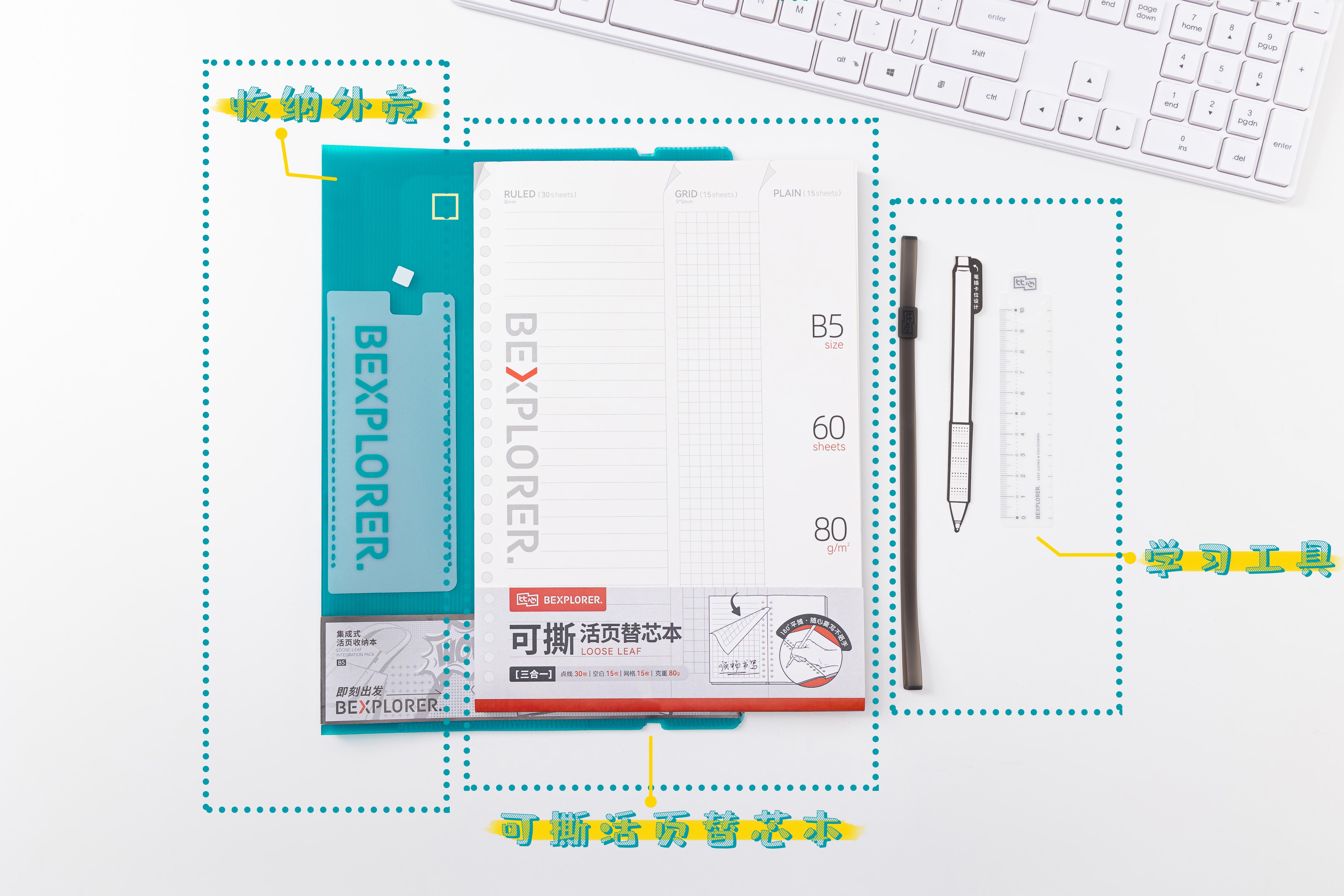 自帶學(xué)習(xí)工具的本子,在活頁(yè)本外殼基礎(chǔ)上增設(shè)筆插位、減壓硅膠繩、雙層插袋、軟尺,