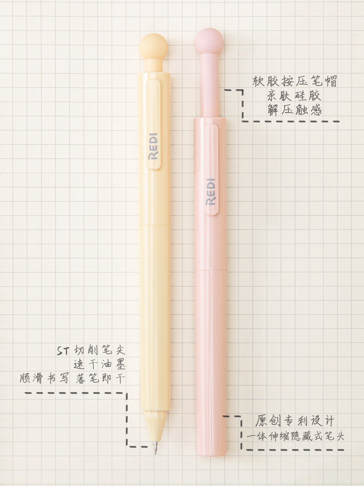 別出心裁的軟膠按壓筆帽,軟糯小圓球 擁有云朵般解壓觸感,